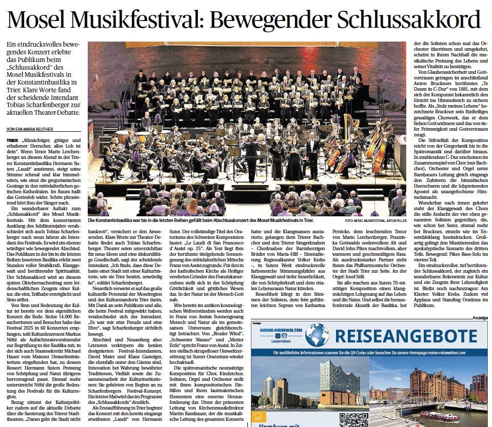 Wir freuen uns mit den Solist/innen, den Musizierenden des Philharmonischen Orchesters Trier, den Trierer Sängerknaben, den Sängerinnen und Sängern des Trierer Bachchores und KMD Martin Bambauer über den fulminanten "Schlussakkord" des diesjährigen Moselmusikfestivals am 03.10.2025!